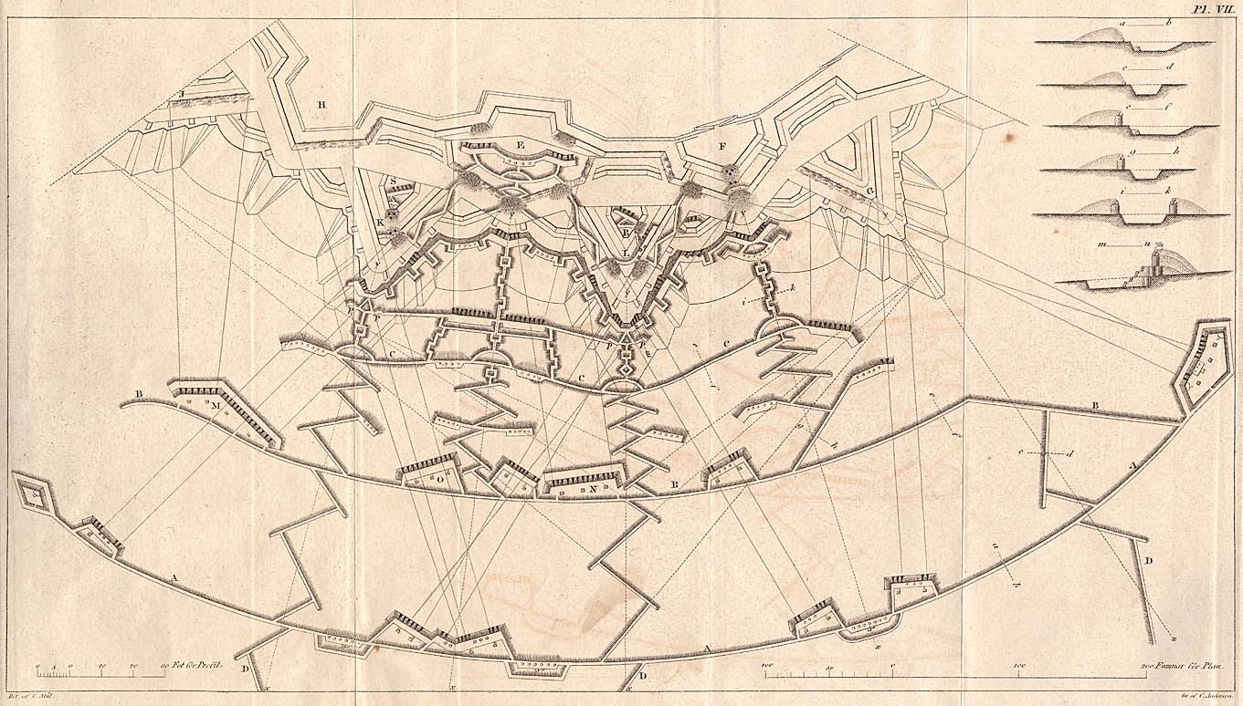 Här ett exempel (plansch VII) från den nära nog kultförklarade första upplagan av ”Lärobok i befästningskonsten” (J. A. Hazelius ,1836).